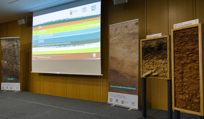 „Da steckt Geschichte drin“: Bühne der Festveranstaltung zum Boden des Jahres 2026 in der Landesvertretung Hessen in Berlin. Im Vordergrund die Lackprofile des Kohlenmeilerbodens (Archiv der Kulturgeschichte) und des Ferrallits (Archiv der Naturgeschichte).