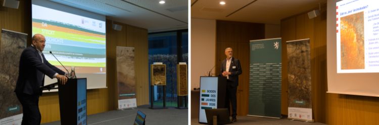 Ingmar Jung, Hessischer Minister für Landwirtschaft, Umwelt, Weinbau, Forsten, Jagd und Heimat, als Schirmherr des Bodens des Jahres 2026 bei den Grußworten (links). Prof. Thomas Schmid (HLNUG) bei der Laudatio auf den Archivboden (rechts). (Fotos D. Schwindt)