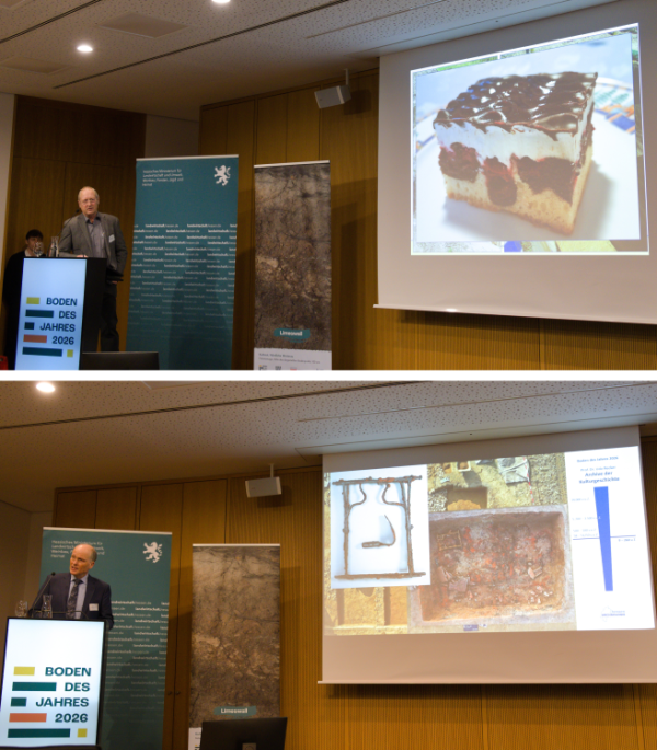 Sonja Medwedski, neue Vorsitzende und Gerhard Milbert, langjähriger Vorsitzender und neuer stellvertretender Vorsitzender des Kuratoriums Boden des Jahres, mit den Lackprofilen zum Boden des Jahres 2026: dem Kohlenmeilerboden als Archiv der Kulturgeschichte und dem Ferrallit als Archiv der Naturgeschichte (linkes Foto). Dankesworte an Gerhard Milbert für seine langjährige Tätigkeit und Ehrung als „Bodenkundler des Jahres“ im Rahmen der Festveranstaltung, überreicht von Sonja Medwedski und Prof. Dr. Daniela Sauer (rechts). (Fotos D. Schwindt)