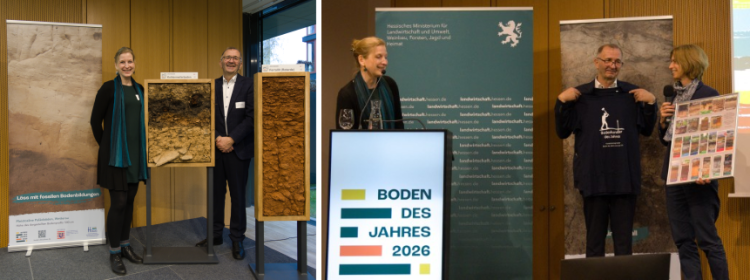 Sonja Medwedski, neue Vorsitzende und Gerhard Milbert, langjähriger Vorsitzender und neuer stellvertretender Vorsitzender des Kuratoriums Boden des Jahres, mit den Lackprofilen zum Boden des Jahres 2026: dem Kohlenmeilerboden als Archiv der Kulturgeschichte und dem Ferrallit als Archiv der Naturgeschichte (linkes Foto). Dankesworte an Gerhard Milbert für seine langjährige Tätigkeit und Ehrung als „Bodenkundler des Jahres“ im Rahmen der Festveranstaltung, überreicht von Sonja Medwedski und Prof. Dr. Daniela Sauer (rechts). (Fotos D. Schwindt)